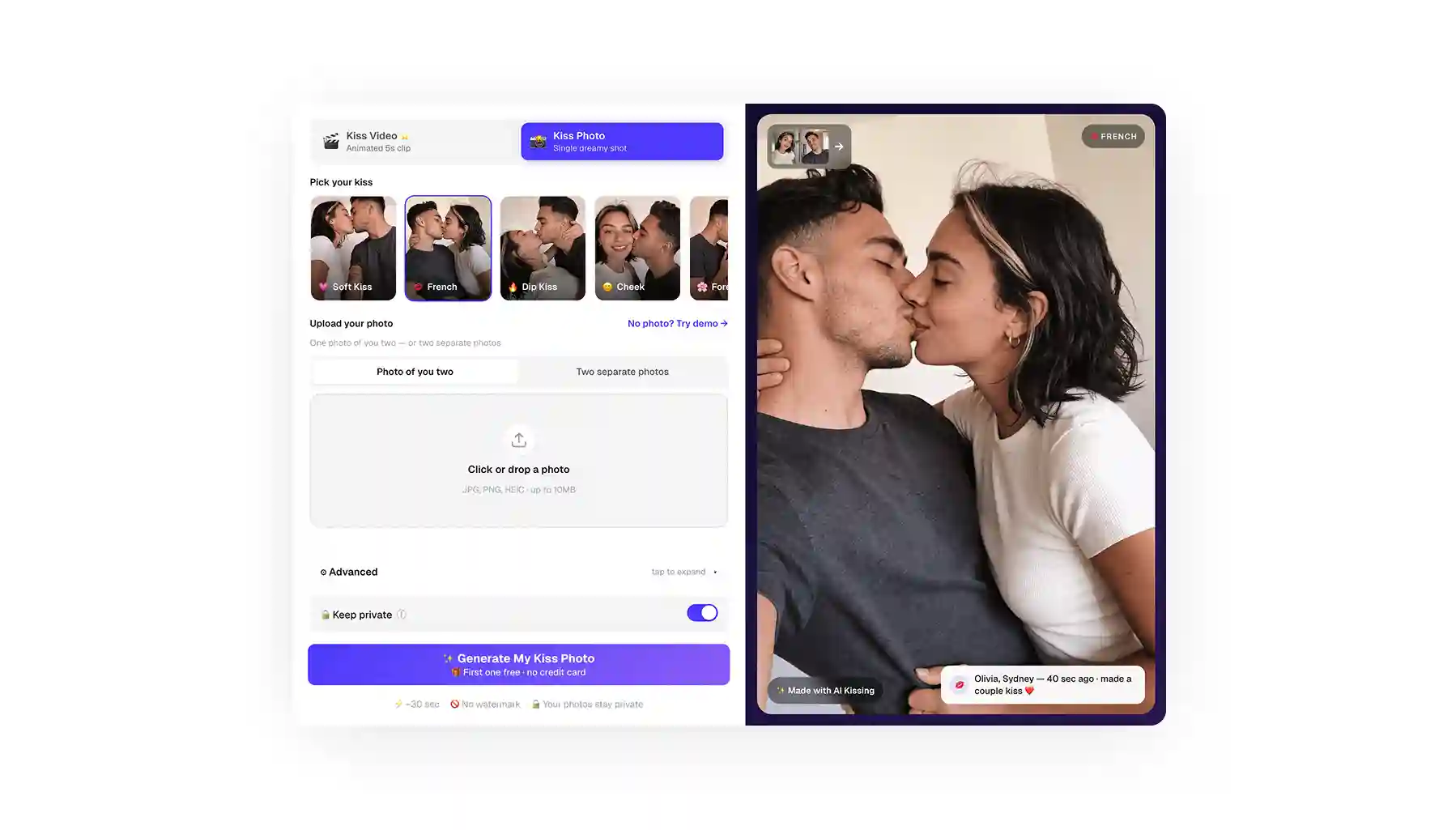 Your first AI kiss photo is free with no signup. Videos are paid only and delivered in HD without watermarks.
