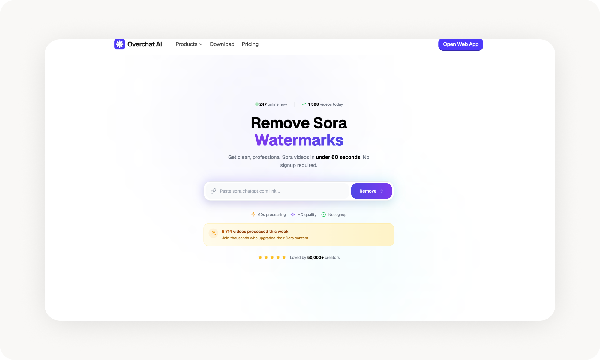 Processing happens in your browser, and files are handled securely for privacy. Just like with Overchat AI — no signup is required. If you’re working with multiple Sora videos, there’s also batch uploads — process all files automatically and save hours of manual editing.
