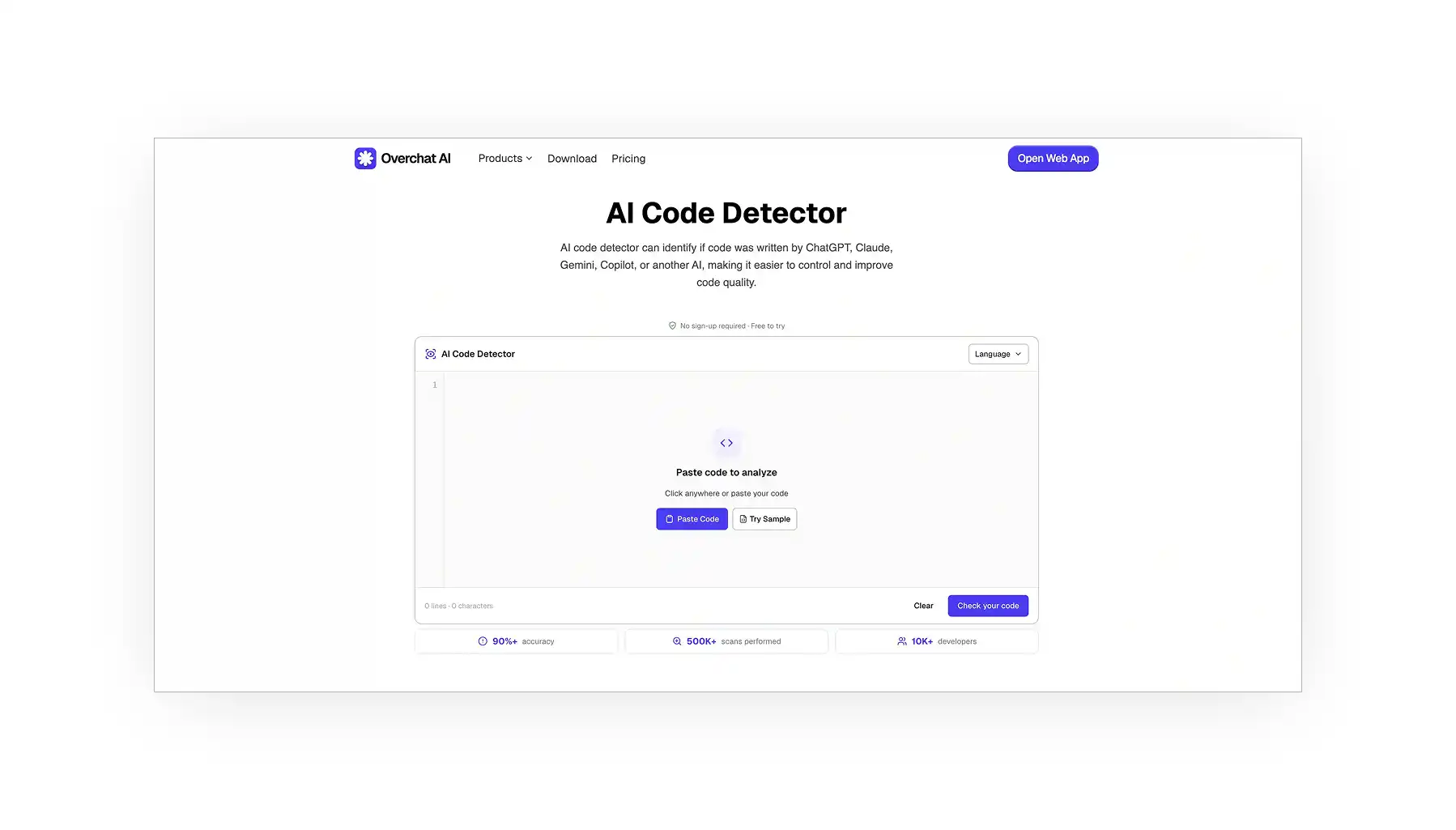 Overchat AI code detector is a free online tool powered by a fine-tuned language model, which offers over 90% detection accuracy across more than 15 programming languages.