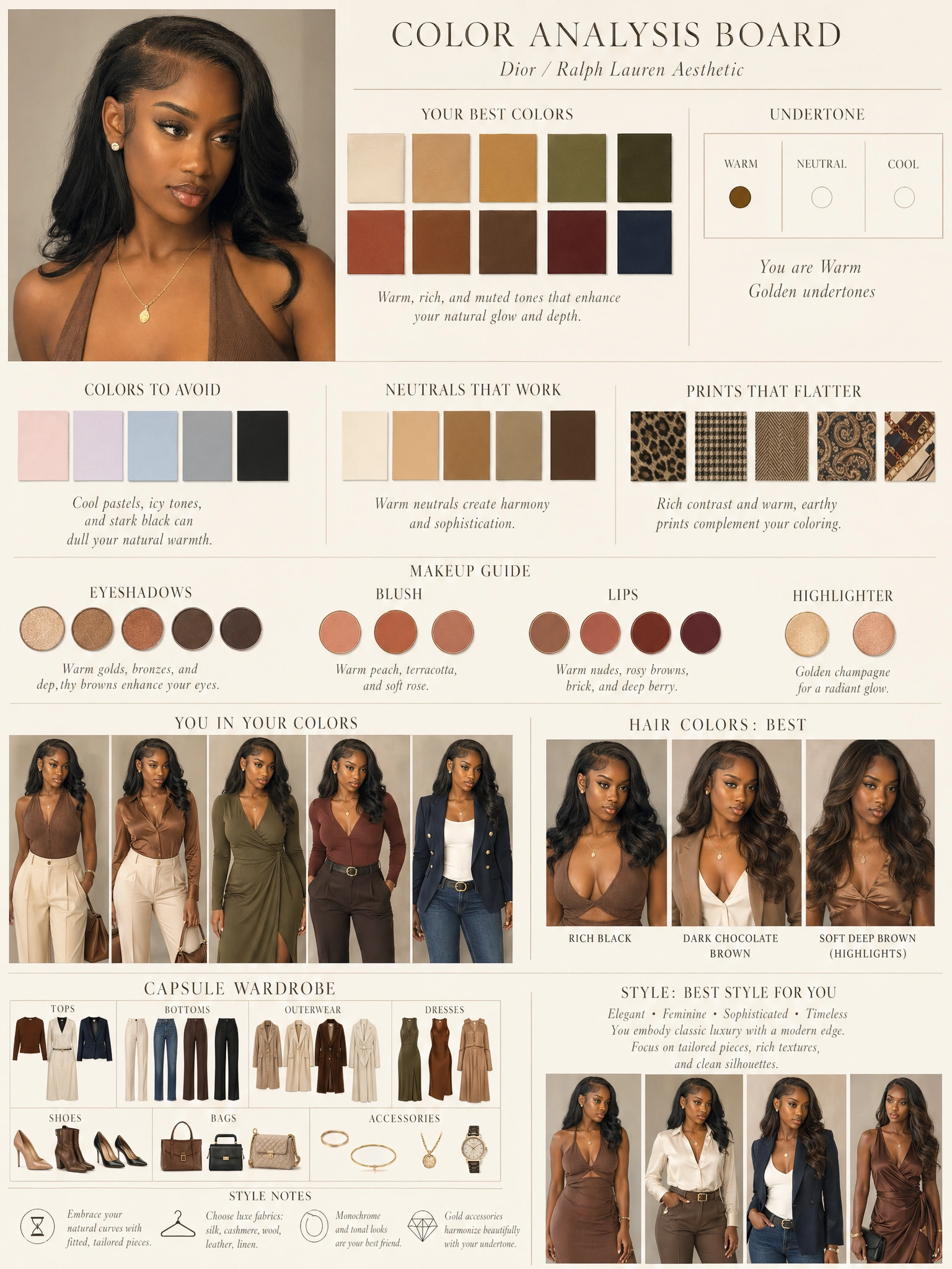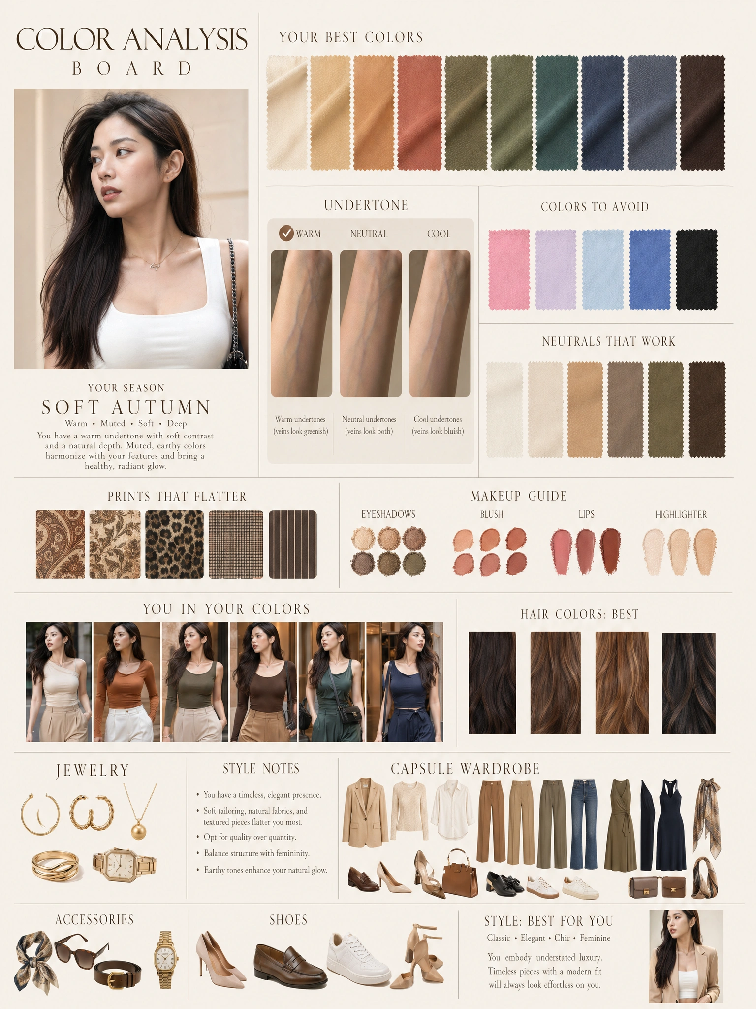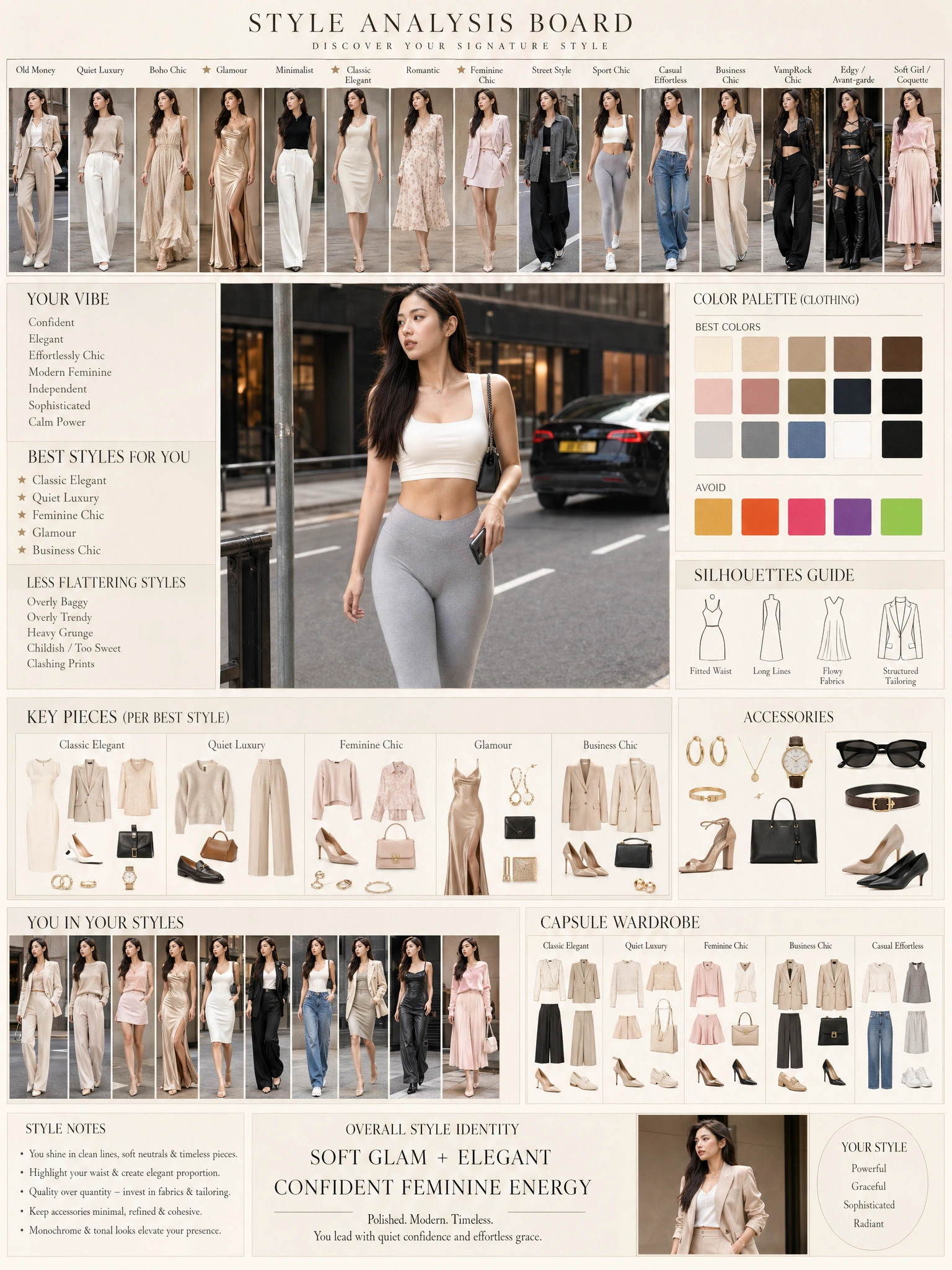 Get more than a label. Your report breaks down dominant colors, body line, style archetype, what to wear more of, and what to retire — section by section.