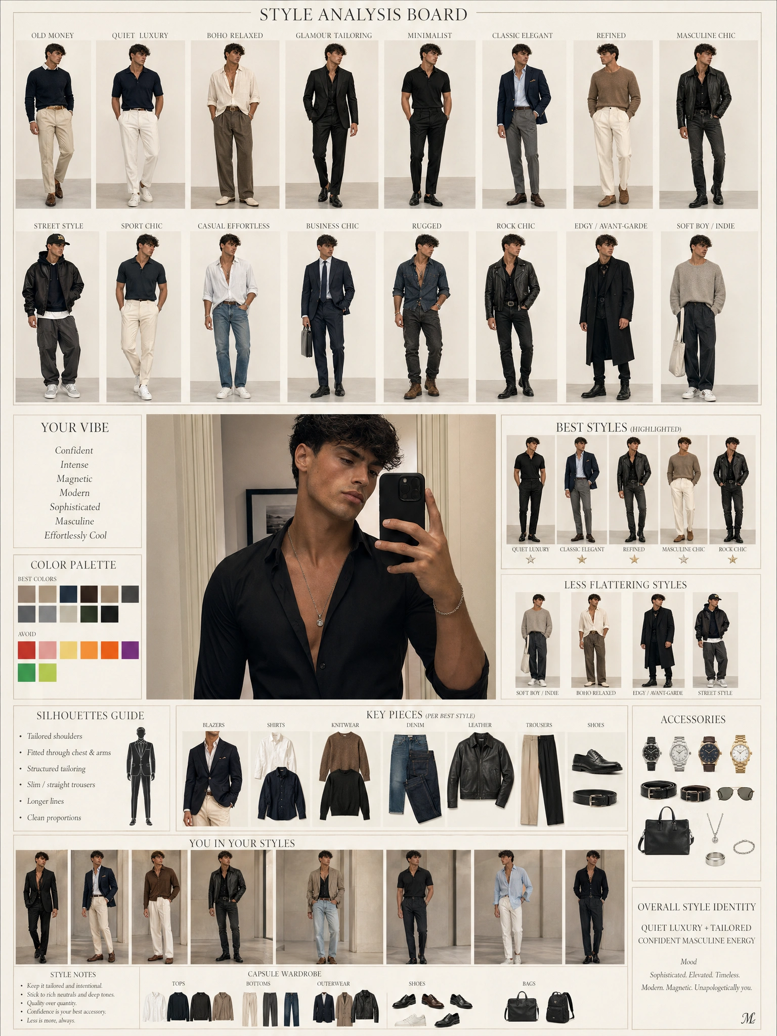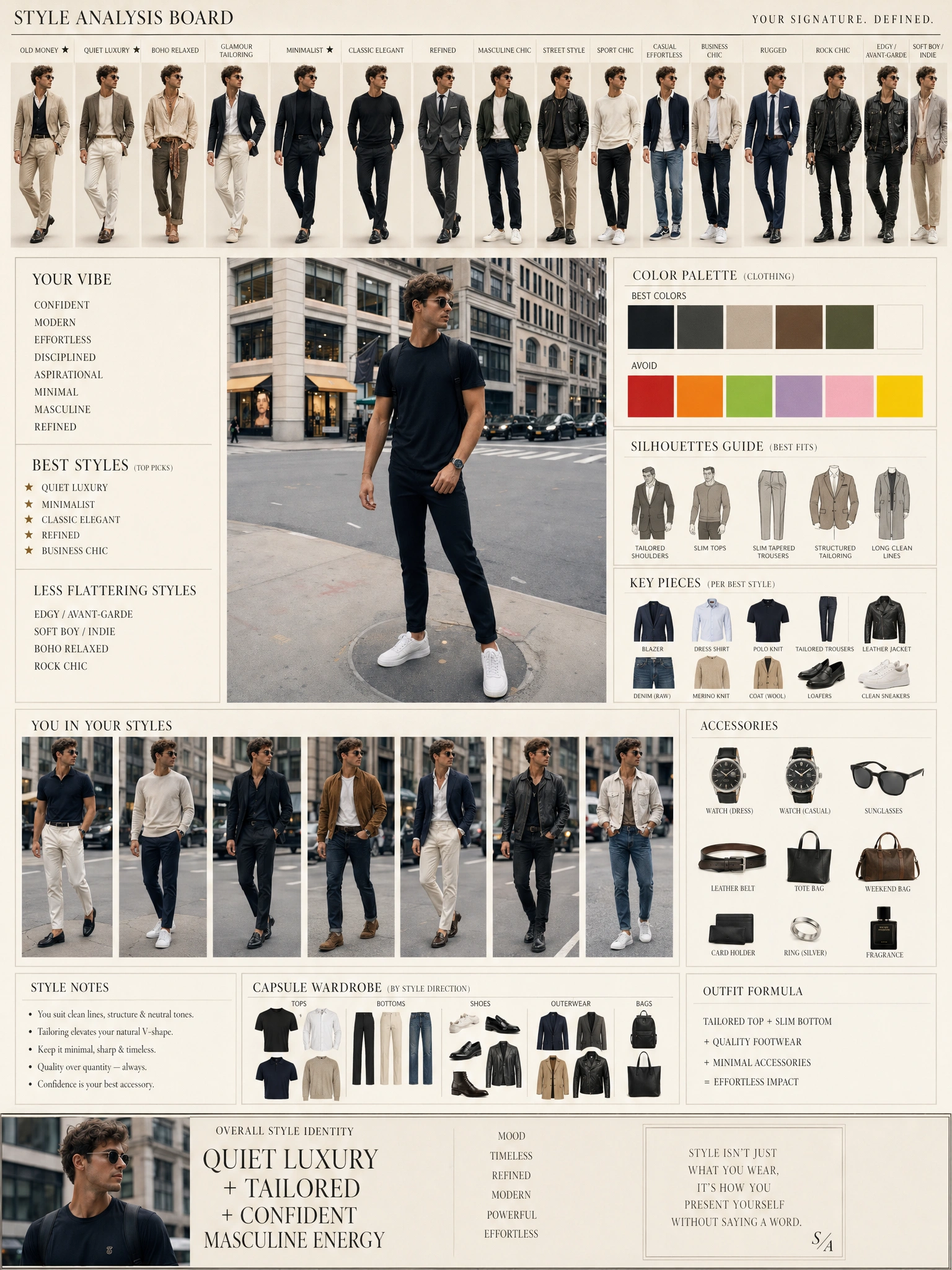 It's an online tool that takes a single photo of you and produces a detailed visual report of your personal style — think color palette, silhouette, style archetype, vibe descriptors, and tailored recommendations. Unlike a generic style quiz, it actually looks at the image and analyzes how you present, then packages the result as a clean infographic you can save or share.
